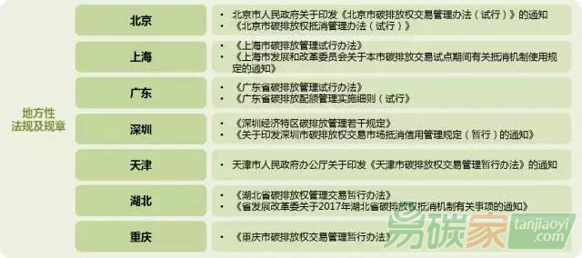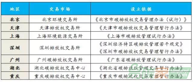 七個試點市場:2011年10月,我國啟動了碳排放權交易試點工作,國家發(fā)改委下發(fā)了《關于開展碳排放權交易試點工作的通知》,批準北京、天津、上海、重慶四個直轄市,湖北?。ㄎ錆h)、廣東?。◤V州)以及深圳經濟特區(qū)開展碳排放權交易的試點工作。上述七個試點地區(qū)分別以地方性法規(guī)或地方政府規(guī)章的形式制定了相應的碳排放權交易管理規(guī)定,建立了碳排放權交易市場,由各交易市場制定具體的交易規(guī)則并報國務院碳排放權交易主管部門備案。