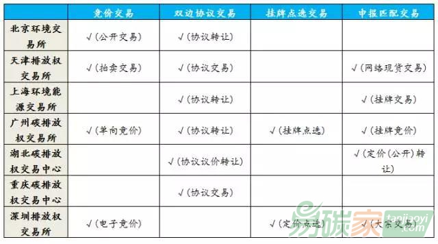 從成交機制上看,目前碳排放權交易所的交易方式大致包括競價交易、雙邊協(xié)議交易、掛牌點選交易和申報匹配交易這幾種類型。各交易所在此基礎上發(fā)展出了公開交易、拍賣交易、掛牌交易、網絡現貨交易、掛牌點選、電子競價和大宗交易等多種方式進行交易,結合各交易所交易規(guī)則中的描述,大致梳理如下: