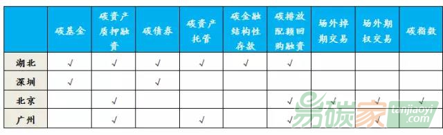 我們注意到, 北京、湖北、深圳、廣州試點等地的交易所都嘗試開展了相關的碳排放權交易的金融衍生品服務,多集中在基金、債券、質押融資、回購融資等項目;同時,也有交易者選擇在場外進行衍生品交易,全國碳排放權配額的首筆期權交易(廣州守仁環(huán)境能源股份有限公司與殼牌能源有限公司)即采用了場外交易的方式,因此我們理解碳排放權交易的金融衍生品可發(fā)生在交易所內也可以在場外進行。基于市場公開信息,我們對于部分試點地區(qū)的碳排放權衍生產品梳理如下: