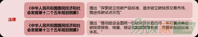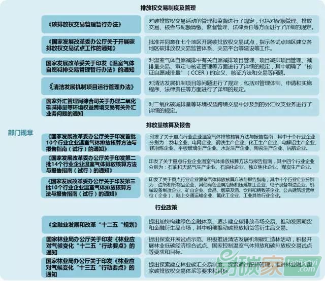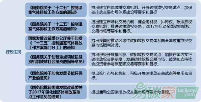 建設全國性市場的目標:《中華人民共和國國民經濟和社會發(fā)展第十三個五年規(guī)劃綱要》中提出要推動建設全國統(tǒng)一的碳排放交易市場;國家發(fā)改委也于2016年11月印發(fā)了《“十三五”控制溫室氣體排放工作方案部門分工》,明確了我國將推動區(qū)域性碳排放權交易體系向全國碳排放權交易市場順利過渡,并于2017年啟動運行全國碳排放權交易市場。
