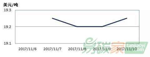 2017年11月6日至2017年11月12日新西蘭碳單位(New Zealand Unit, NZU)的現(xiàn)貨價(jià)格在19.2-19.25美元/噸之間。