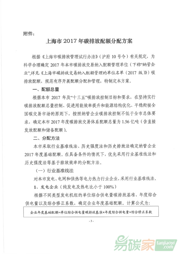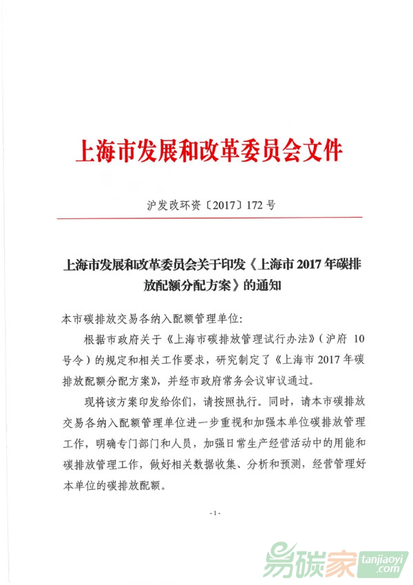上海市發(fā)展和改革委員會(huì)關(guān)于印發(fā)《上海市2017年碳排放配額分配方案》的通知【滬發(fā)改環(huán)資[2017]172號(hào)】(全文)