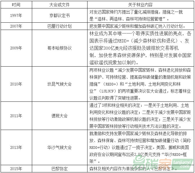 林業(yè)已納入了應(yīng)對(duì)氣候變化的國(guó)際進(jìn)程,在國(guó)際氣候行動(dòng)中越來(lái)越受到關(guān)注。林業(yè)議題幾乎是每次聯(lián)合國(guó)氣候變化大會(huì)最受關(guān)注且最易達(dá)成共識(shí)的談判議題。各次氣候變化大會(huì)林業(yè)有關(guān)的內(nèi)容簡(jiǎn)述如下: