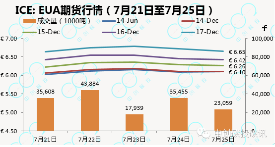洲際交易所(ICE)的EUA當月期貨合約(Jul14 EUA)和2014年12月期貨合約(Dec14 EUA)周五分別收于6.11歐元和6.10歐元,2015-2017年12月期貨合約周五價格分別為6.26、6.42和6.65歐元;相比前一周,當月期貨價格上漲2.2%,其它合約則基本持平。五種期貨合約成交量合計155945手(15594.5萬噸),比前一周增加約24070手。