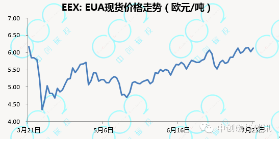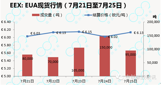 拍賣推遲(back-loading)政策導致的市場配額供應減少的利好依舊在持續(xù)刺激著歐盟碳市場的復蘇。上周(7月21日至25日),歐盟碳配額(EUA)價格延續(xù)近期緩慢回升的走勢。歐洲能源交易所(EEX)的歐盟碳配額(EUA)現(xiàn)貨價格重新回到6歐元/噸之上,且整周價格都保持在6歐元的平臺之上,周三時最高達到6.15歐元/噸,為近四個月以來的最高價,在周四因企業(yè)和投資者出售套現(xiàn)而短暫下挫之后,周五又回到6.13歐元/噸,比前一周上漲2.5%。周成交量合計50萬噸,比前一周增加8.9萬噸。