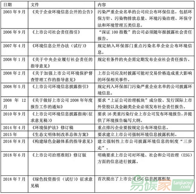 2015年《生態(tài)文明體制改革總體方案》要求建立上市公司強制環(huán)境信息披露機制。在《生態(tài)文明體制改革總體方案》的指導下,近三年來國內(nèi)ESG信息披露得到了快速的發(fā)展。2016年8月,《構(gòu)建綠色金融體系的指導意見》分工方案明確提出,我國要分步驟建立強制性上市公司披露環(huán)境信息的制度。方案分為“三步走”:第一步為2017年起,被原環(huán)境保護部列入重點排放企業(yè)名單的上市公司強制性披露環(huán)境信息;第二步在2018年實行“半強制”環(huán)境信息披露,企業(yè)不披露相關信息必須解釋為何不披露;第三步到2020年,所有上市公司強制披露環(huán)境信息。2018年6月15日,中國證監(jiān)會發(fā)布了《上市公司治理準則》修訂版;2018年7月,中國基金業(yè)協(xié)會發(fā)布了《綠色投資指引(試行)》。至此為止,中國監(jiān)管部門明確要求上市公司對環(huán)境、社會和公司治理方面的信息進行披露并提供了上市公司ESG信息披露框架。下表對中國ESG信息披露的重要文件進行了總結(jié)。