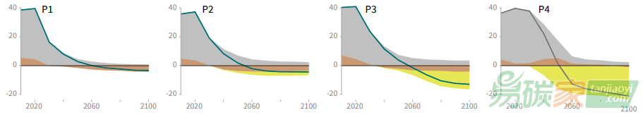 報告給出了將升溫控制在1.5°C以內的四種說明性方案,灰色為化石燃料和工業(yè)領域,棕色表示農林及其他土地利用,黃色為生物質能源+二氧化碳捕獲和儲存,示意不同手段在不同時段的貢獻比例。后三種路徑均使用到二氧化碳捕獲和儲存技術,并且,其貢獻比例隨時間推進有所增加。單位:十億噸/年 (圖片來源:IPCC SR1.5 SPM-19)。