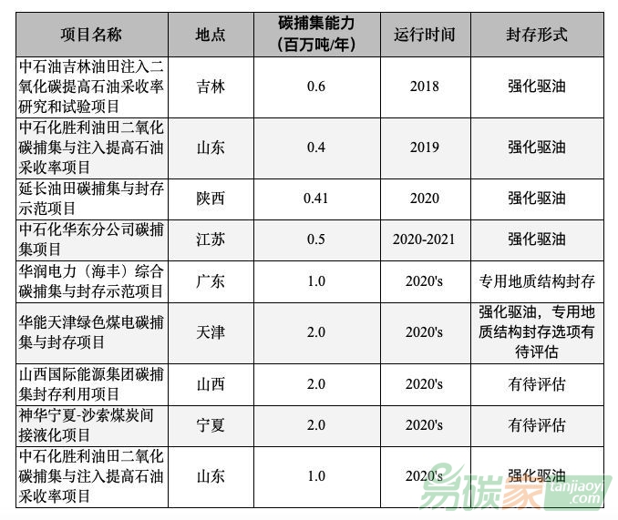 中國境內的大型CCS示范項目(更新時間:2018年8月)