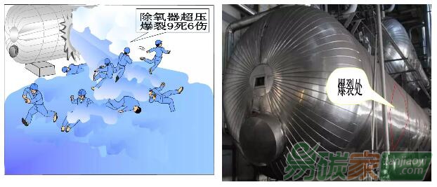 某年1月11日,某廠運行人員發(fā)現(xiàn)除氧器水位低于規(guī)定水位,為了急于交接班,開啟了兩臺水泵給除氧器補水,使得除氧器水位上升,壓力下降。運行人員為迅速提高壓力,違反規(guī)定打開二段抽氣,由于抽氣系統(tǒng)閥門失靈,加之盲目操作,除氧器壓力急劇上升,由于安全閥定值偏高,起不到保護作用,導致除氧器超壓爆炸,造成9人死亡,3人重傷,3人輕傷。