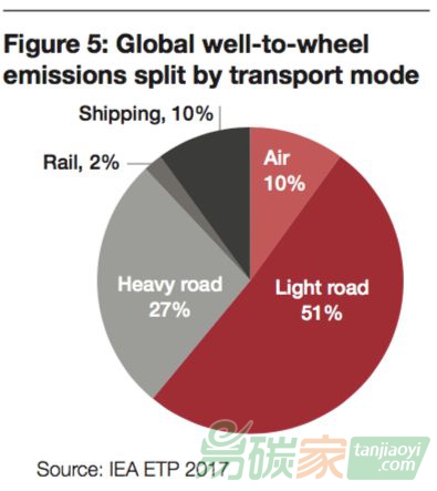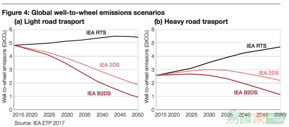 碳排放量占到了全球總量的22%,而其中,公路交通占到了行業(yè)總排放量的77%(見圖一)。因此,為了實(shí)現(xiàn)遏制全球氣候變暖在2°C以下的目標(biāo),該行業(yè)的“脫碳”行動(dòng)勢(shì)在必行。在國(guó)際能源署2°C情景之下,輕型道路運(yùn)輸排放(light road emission)需要較現(xiàn)在減少約60%的碳排放,而重型道路運(yùn)輸排放(heavy road emission)則需要減少約14%(見圖二)。