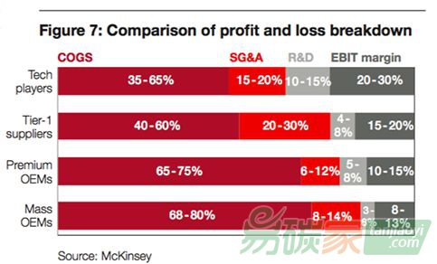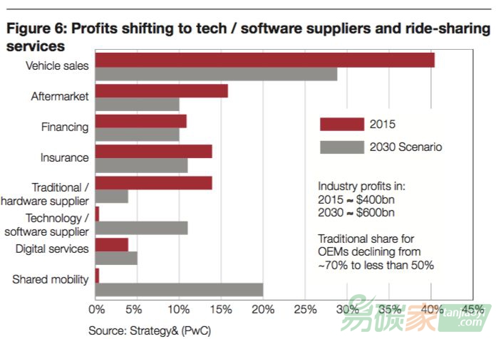 目前,全球汽車總保有量突破10億, 每年汽車銷售帶來(lái)超過2萬(wàn)億美元的收入。然而,這些收益預(yù)計(jì)未來(lái)將會(huì)逐漸流入技術(shù)/軟件供應(yīng)商以及共享出行服務(wù)商(見圖三)。