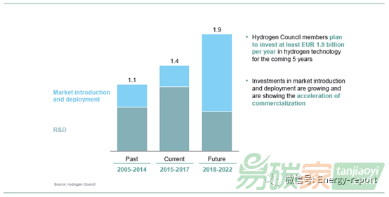法規(guī)并沒有體現(xiàn)發(fā)展氫能的好處。例如,德國的法規(guī)對氫儲能中電能的輸入和輸出征收雙重稅,導致發(fā)電企業(yè)沒有太大積極性去發(fā)展氫儲能以利用丟棄的電量。燃料電池和制氫系統(tǒng)的成本競爭力及性能水平近年來有所提升(例如,燃料電池的成本下降超過50%),但由于建立的行業(yè)標準仍然有限,燃料電池性能的提升并未充分發(fā)揮其潛力。推進能源轉型需要針對燃料電池和氫能體系建立統(tǒng)一的地區(qū)和行業(yè)標準,以便在研發(fā)、應用(RD&D)和制造等方面實現(xiàn)規(guī)模經濟。氫能理事會成員單位計劃將投資從研發(fā)和應用向商業(yè)化轉移(如圖8所示)。