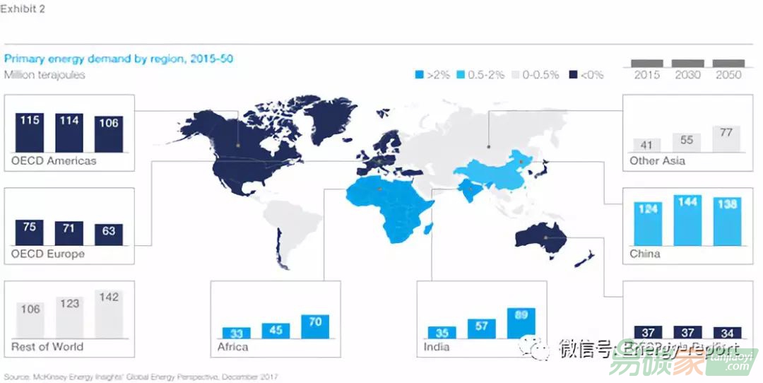 從總體上看,我們看到,在全球能源需求繼續(xù)增長(zhǎng)的同時(shí),增長(zhǎng)速度卻在迅速放緩。經(jīng)過幾十年的初級(jí)能源需求年增長(zhǎng)率超過2%,我們預(yù)計(jì)世界將經(jīng)歷一段緩慢增長(zhǎng)的時(shí)期——2015-30年的年增長(zhǎng)率為0.9%,2030-50年的年增長(zhǎng)率僅為0.5%。如果我們看看這些發(fā)展背后的驅(qū)動(dòng)因素,我們就會(huì)發(fā)現(xiàn),持續(xù)增長(zhǎng)是由人口和經(jīng)濟(jì)擴(kuò)張驅(qū)動(dòng)的,尤其是新興經(jīng)濟(jì)體中不斷壯大的中產(chǎn)階級(jí)。與此同時(shí),有兩個(gè)結(jié)構(gòu)性發(fā)展將導(dǎo)致這種增長(zhǎng)放緩。首先,許多國(guó)家的經(jīng)濟(jì)結(jié)構(gòu)將發(fā)生轉(zhuǎn)變,人口老齡化和從工業(yè)向服務(wù)業(yè)的全面過渡。我們已經(jīng)在許多高收入國(guó)家看到了這種發(fā)展,現(xiàn)在預(yù)計(jì)在中國(guó)等國(guó)也會(huì)出現(xiàn)同樣的情況。其次,由于向更節(jié)能的燃料和技術(shù)的轉(zhuǎn)變,能源強(qiáng)度將有很大改善。例如電氣化,即用電作為傳統(tǒng)燃料的替代品,以及家庭和工業(yè)部門使用的設(shè)備和機(jī)器的能源效率更高。從地理上看,我們預(yù)計(jì)經(jīng)合組織國(guó)家(2015年占全球40%)的能源需求將加速下降,中國(guó)(2015年占全球22%)的能源需求將在2030年左右見頂。增長(zhǎng)最強(qiáng)勁的地區(qū),尤其是非洲和印度,起點(diǎn)較低(各占2015年總需求的6%),但到2050年將超過歐洲的需求水平。