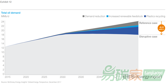 化工行業(yè)穩(wěn)定的油氣需求增長(zhǎng)與化學(xué)物質(zhì)之間的需求強(qiáng)勁和GDP和人口的增長(zhǎng)有很強(qiáng)的相關(guān)性,以及與大部分的石油和天然氣作為原料而不是能源(~ 80%的石油和天然氣化學(xué)物質(zhì)作為原料)有關(guān)。預(yù)期的能源效率提高將主要減少非原料的化石燃料需求。要了解化石燃料在化學(xué)行業(yè)的未來(lái),有三個(gè)趨勢(shì)是值得關(guān)注的。對(duì)化工產(chǎn)品,特別是塑料制品的需求塑料的使用面臨越來(lái)越大的監(jiān)管壓力。我們預(yù)計(jì),2030年后,由于使用和替代減少,原生塑料消費(fèi)(主要使用基于液體的原料)和GDP增長(zhǎng)將脫鉤。塑料回收利用目前人們對(duì)循環(huán)性和可回收性有很多關(guān)注。然而,要增加對(duì)難回收塑料的回收利用,還需要改進(jìn)消費(fèi)廢物收集、技術(shù)突破和產(chǎn)業(yè)規(guī)模。生物基(biobased)替代品生物基替代品一方面對(duì)可再生原料的需求可能導(dǎo)致選定生產(chǎn)路線,另一方面對(duì)這些趨勢(shì)的敏感性很高。在一個(gè)顛覆性的場(chǎng)景中,我們假設(shè)這些趨勢(shì)每一個(gè)都比我們的參考案例翻倍,那么化學(xué)石油需求將在2030年達(dá)到峰值,到2050年,需求將比我們的參考案例低25%左右。