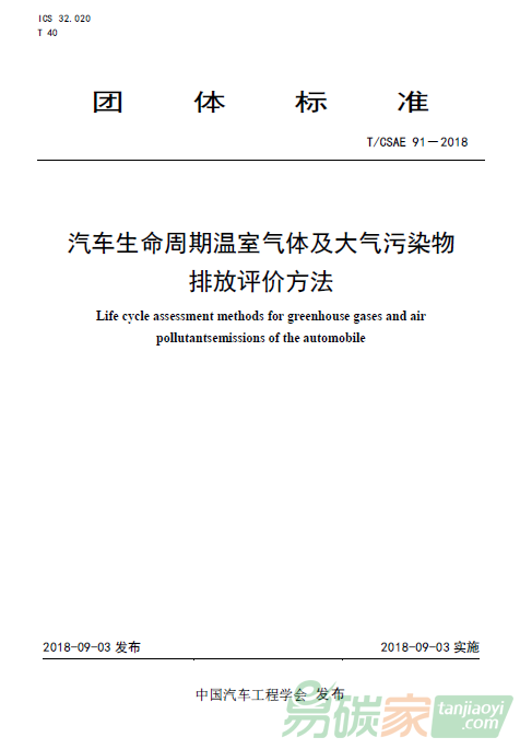 2018年9月,中國汽車工程學會發(fā)布了測算標準《汽車生命周期溫室氣體及大氣污染物排放評價方法》)(T/CSAE91-2018)。