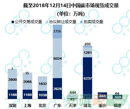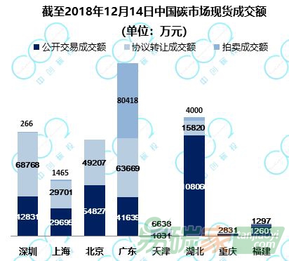截至2018年12月14日,8個(gè)區(qū)域碳市場(chǎng)一、二級(jí)現(xiàn)貨市場(chǎng)累計(jì)成交2.80億噸,成交額61.48億元。廣東、湖北成交量最高,位于第一梯隊(duì);深圳、上海、北京位于第二梯隊(duì);而天津、重慶、福建的成交量相對(duì)較低,位于第三梯隊(duì)。