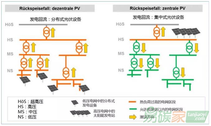 配電網(wǎng)的改造是電力的流向造成的。過去,電力在傳統(tǒng)的發(fā)電廠或者集中式光伏電站升壓后送到高壓輸電網(wǎng),傳輸過程中一級(jí)一級(jí)地降低電壓,最后到用戶?,F(xiàn)在,分布式光伏發(fā)電是在低壓端并網(wǎng)。一旦光伏發(fā)的電在低壓端消納不了,則就會(huì)通過變壓器送到上一級(jí),上一級(jí)再消納不了,就會(huì)輸送到再上一級(jí)。這樣一級(jí)一級(jí)地送上去,低壓網(wǎng)里的電壓就高得不得了,一般升上兩級(jí),低壓網(wǎng)的電壓就會(huì)突破安全上限了。在這個(gè)時(shí)候就需要將傳統(tǒng)的變壓器換成可調(diào)壓的變壓器。用這么個(gè)方法改造幾億千瓦的配電網(wǎng),估計(jì)得幾千億元,搞不好甚至?xí)_(dá)到萬億元的級(jí)別。