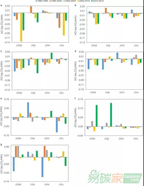 本研究在前人研究的基礎(chǔ)上,通過使用多維指數(shù)分解分析(IDA)對影響1990年至2014年間五個時期全球電力ACI變化的各種因素進(jìn)行分析,衡量每單位電力產(chǎn)生的二氧化碳排放水平,從全球和國家角度識別其主要驅(qū)動因素。并將全球ACI進(jìn)行分解,并進(jìn)行發(fā)電效率變化和非化石能源份額變化的統(tǒng)計分析。