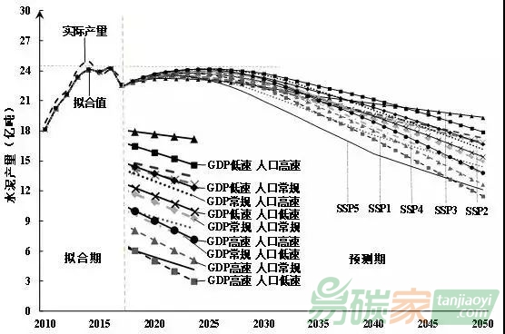 圖4 各情景下的水泥產(chǎn)量(2010~2050年)