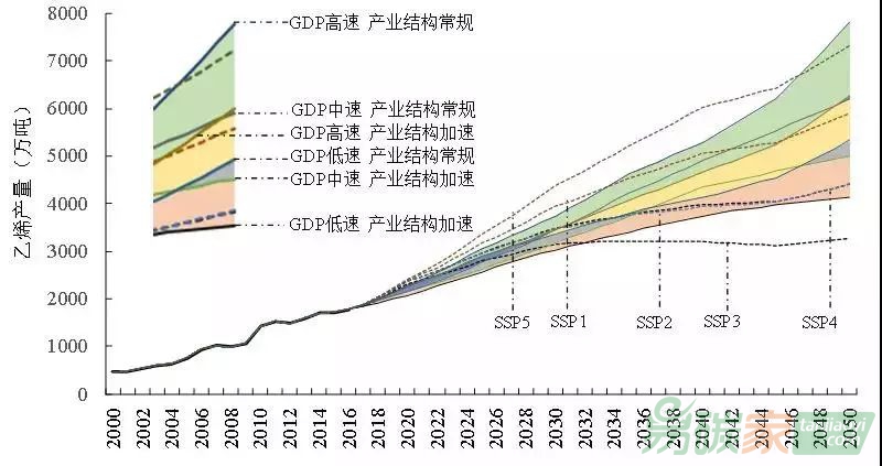 圖5 乙烯未來產(chǎn)量預(yù)測值(2000~2050年)