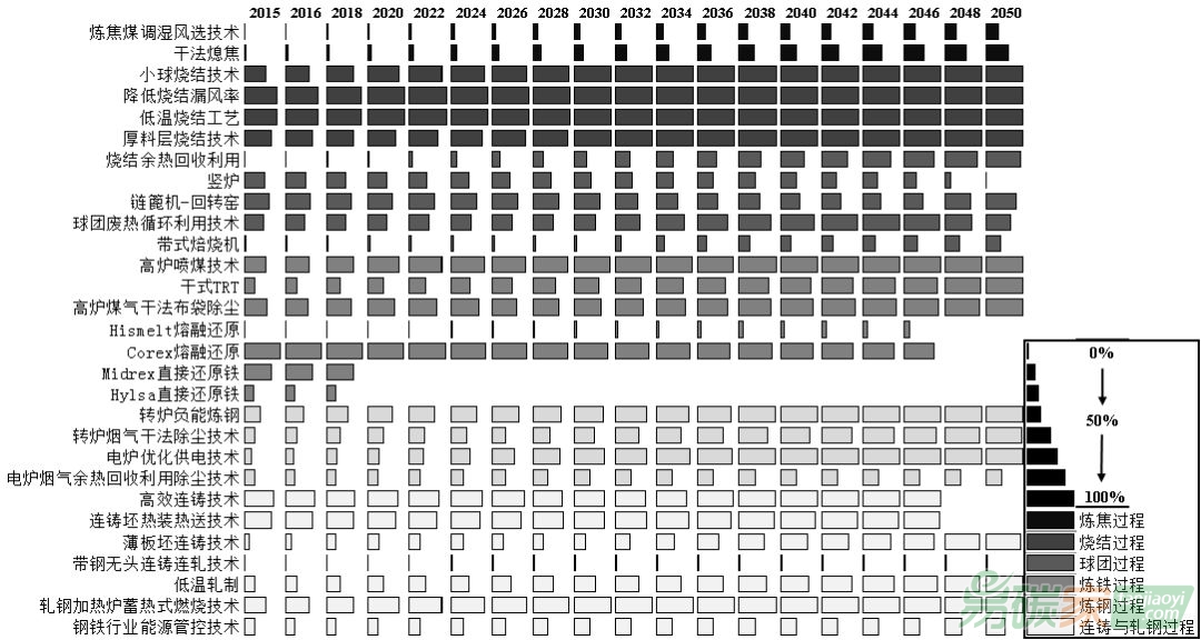 圖8 中需求+強(qiáng)化政策情景下鋼鐵行業(yè)的節(jié)能技術(shù)發(fā)展路徑(2015~2050年)