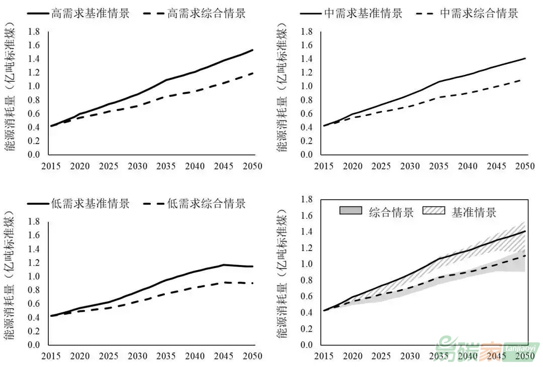 圖11 不同客運(yùn)需求情景下城際客運(yùn)交通能耗情況及對比