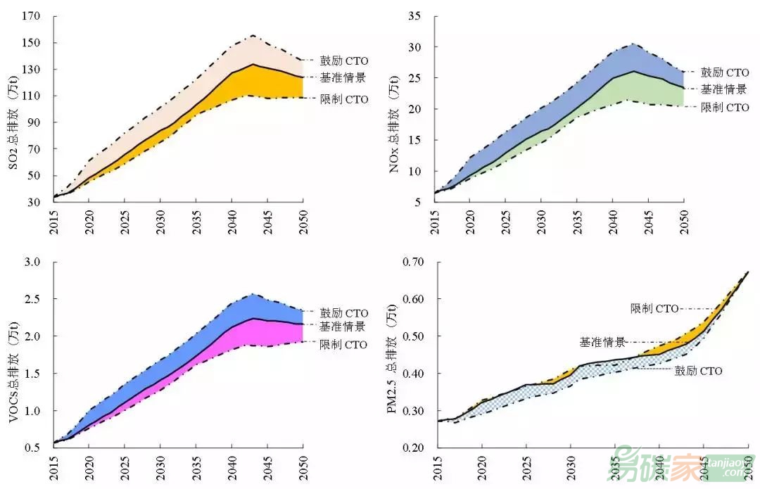 圖10 不同生產(chǎn)方式情景下幾種污染物的排放情況(2015~2050年)