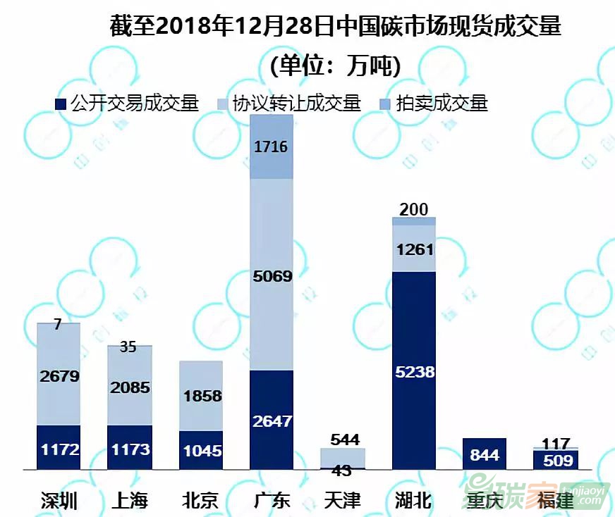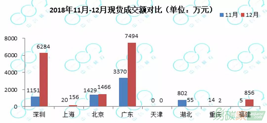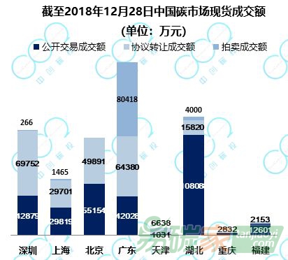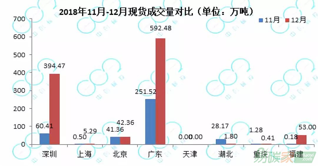 截至2018年12月28日,一、二級(jí)現(xiàn)貨市場(chǎng)累計(jì)成交2.82億噸,成交額61.89億元。廣東、湖北成交量最高,位于第一梯隊(duì);深圳、上海、北京位于第二梯隊(duì);而天津、重慶、福建的成交量相對(duì)較低,位于第三梯隊(duì)。
