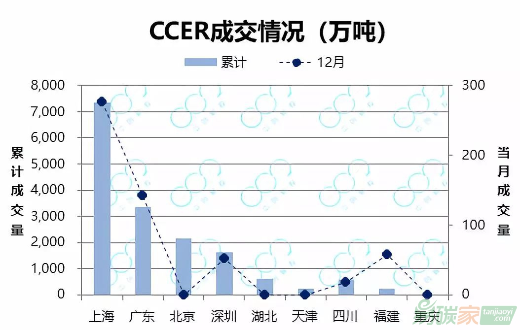 2018年12月,各交易所CCER共計(jì)成交546.46萬噸,較11月上漲了49%。其中,上海和廣東較為活躍,分別成交276.1萬噸和142.5萬噸,分別占當(dāng)月總成交的51%和26%。截至2018年12月28日,9個(gè)備案的交易所累計(jì)成交CCER 1.62億噸,其中上海累計(jì)成交7367.7萬噸,占比約46%。