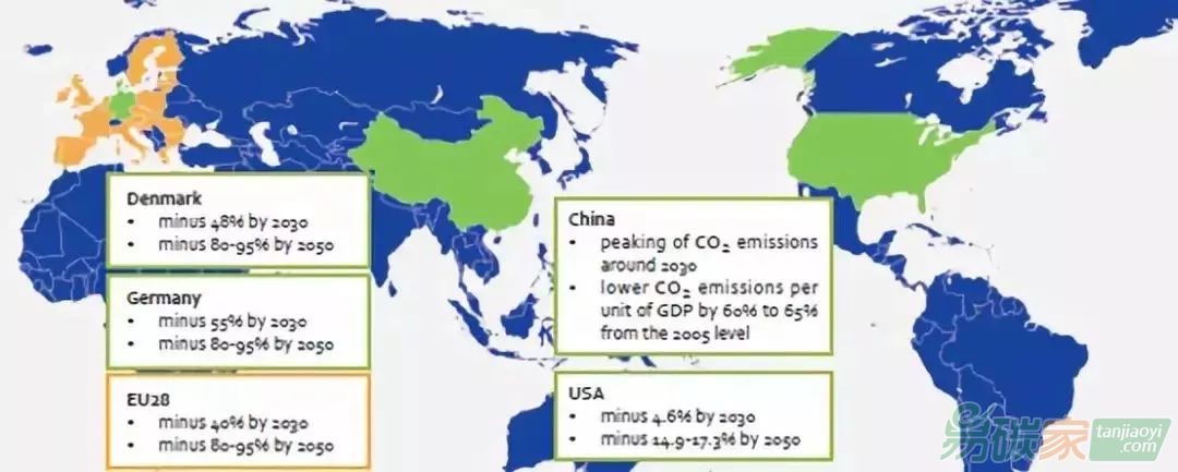 圖中所顯示的數(shù)據(jù)一部分來自提交給聯(lián)合國的國家自主貢獻(xiàn)(Nationally Determined Contributions,NDC)指標(biāo),另一部分來自如丹麥和德國的額外國家指標(biāo)。除非另有說明,所有指標(biāo)的基準(zhǔn)年是1990年。為了便于比較,對于美國來說,根據(jù)美國環(huán)保署(Environmental Protection Agency)的數(shù)據(jù),以2005年為基準(zhǔn)年的NDC官方指標(biāo)已轉(zhuǎn)換為以1990年為基準(zhǔn)年的指標(biāo)。丹麥2030年的溫室氣體減排目標(biāo)是基于丹麥初步的非排放交易體系的減排目標(biāo),即與2005年水平相比減少39%,并非丹麥的官方目標(biāo)。