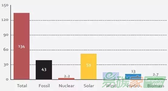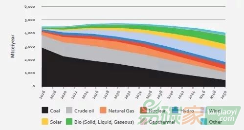 第二次是從煤炭時代轉(zhuǎn)向石油時代,大約在1965年石油超過煤炭成為第一大能源,開創(chuàng)了石油時代。石油在能源結(jié)構(gòu)的占比于1973年達(dá)到峰值,占比為45%,隨后石油占比不斷下降,目前石油仍然處在能源結(jié)構(gòu)中第一大能源位置,但是在整個能源結(jié)構(gòu)中的占比僅33%(2016年)。當(dāng)前人類社會正處于通向第三次能源轉(zhuǎn)型的過程中,許多專家學(xué)者認(rèn)為第三次能源轉(zhuǎn)型將是從化石能源向可再生能源的轉(zhuǎn)型。