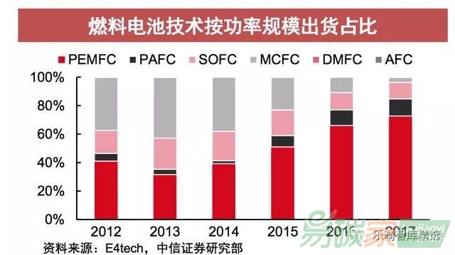 全球市場(chǎng):PEMFC市場(chǎng)空間最大PEMFC在所有技術(shù)路線中出貨規(guī)模占比最高,SOFC增長(zhǎng)較快。按臺(tái)套:2017年P(guān)EMFC銷(xiāo)量4.55萬(wàn)套(+2.2%),占比63%。按功率:2017年P(guān)EMFC出貨487MW(+43%),占比73%。