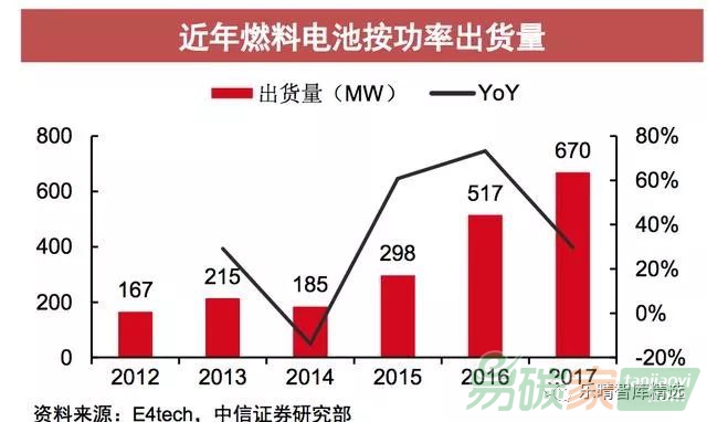 市場(chǎng):燃料電池進(jìn)入快速增長(zhǎng)期2017年全球燃料電池出貨7.3萬(wàn)套(+15%),對(duì)應(yīng)規(guī)模670MW(+30%)。2012-17年累計(jì)出貨37.3萬(wàn)套,CAGR=10%;累計(jì)規(guī)模2511MW,CAGR=32%。單套燃料電池平均容量持續(xù)提升:1)結(jié)構(gòu)變化,2)技術(shù)提升。
