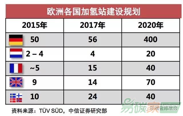 歐洲市場(chǎng):穩(wěn)步推進(jìn)燃料電池汽車(chē)整體規(guī)劃歐盟2008年出臺(tái)燃料電池與氫聯(lián)合行動(dòng)計(jì)劃項(xiàng)目(FCH-JU),2011年啟動(dòng)“H2movesScandinavi”和歐洲城市清潔氫能項(xiàng)目(CHIC)。2017年建成百余個(gè)加氫站,15國(guó)加氫站互通互聯(lián)。預(yù)計(jì)2020年實(shí)現(xiàn)燃料電池商業(yè)化應(yīng)用。奔馳燃料電池汽車(chē):2014年推出B級(jí)F-Cell,2017年又推出GLC級(jí)F-CELL,氫燃料儲(chǔ)量4.4kg,最大續(xù)航里程達(dá)到437km。