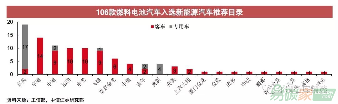 國(guó)內(nèi)燃料電池汽車(chē):106款入選新能源車(chē)推薦目錄2017年第1批至2018年第12批,共21家車(chē)企106款燃料電池汽車(chē)入選??蛙?chē)占75%,專(zhuān)用車(chē)占25%;東風(fēng)(專(zhuān)用車(chē))、宇通(客車(chē))等入選車(chē)型數(shù)量居前。