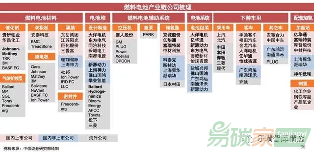 上游:我國(guó)燃料電池核心原材料仍處于實(shí)驗(yàn)室向產(chǎn)業(yè)化過(guò)渡初期,技術(shù)水平相對(duì)落后,缺少自產(chǎn)能力,嚴(yán)重依靠進(jìn)口國(guó)外Ballard、Hydrogenics等公司電堆再進(jìn)行組裝;中游:國(guó)內(nèi)企業(yè)多布局于中游系統(tǒng)集成領(lǐng)域,部分企業(yè)也向上游材料有所延伸;下游:國(guó)內(nèi)主要是主流車(chē)企進(jìn)行儲(chǔ)備和布局。