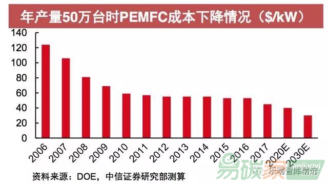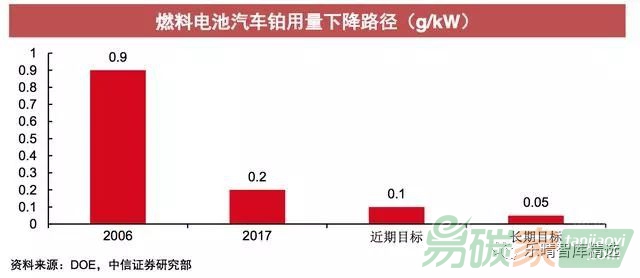 按PEMFC產(chǎn)能50萬(wàn)臺(tái)/年測(cè)算,2017年成本45美元/kW(-15%),較2006年下降64%,距離DOE的2020年40美元/kW、最終30美元/kW的目標(biāo)僅有5美元和15美元的距離。降本關(guān)鍵:降低鉑等貴金屬催化劑用量、提升質(zhì)子交換膜性?xún)r(jià)比。