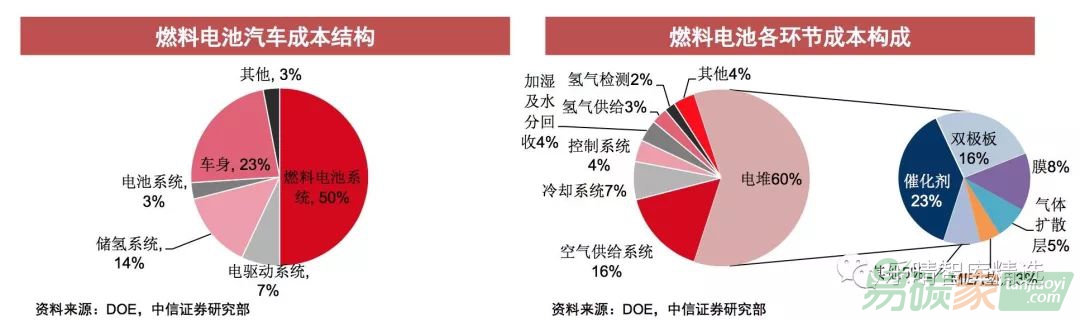 燃料電池市場(chǎng)空間巨大當(dāng)80kW質(zhì)子交換膜燃料電池汽車(chē)年產(chǎn)量達(dá)50萬(wàn)輛,電池系統(tǒng)成本45美元/kW,對(duì)應(yīng)的燃料電池系統(tǒng)市場(chǎng)空間約為18億美元。電堆、空氣供給系統(tǒng)、冷卻系統(tǒng)、控制系統(tǒng)、加濕及水分回收、氫氣系統(tǒng)和其他系統(tǒng)市場(chǎng)空間分別為10.8億美元、2.9億美元、1.3億美元、0.7億美元、0.7億美元、0.9億美元和0.7億美元;電堆的核心材料催化劑、雙機(jī)版、膜、氣體擴(kuò)散層、MEA墊片和其他市場(chǎng)空間分別為4.1億美元、2.9億美元、1.4億美元、0.9億美元、0.5億美元和0.9億美元。隨著國(guó)內(nèi)燃料電池行業(yè)政策支持及試點(diǎn)項(xiàng)目持續(xù)落地,技術(shù)進(jìn)展和產(chǎn)業(yè)化推廣有望提速。報(bào)告來(lái)源 (中信證券:弓永峰 )