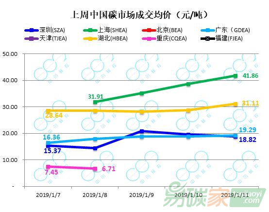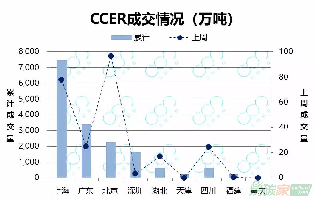 2019年1月7日-1月11日,相比配額市場無成交的情況,北京市場旱現(xiàn)數(shù)筆CCER交易,CCER累計成交量位列各試點之首,達95.4萬噸;同期,湖北市場一改近期CCER交易低潮的狀態(tài),累計成交16.9萬噸。上周,上海CCER市保持活躍,成交量為77.4萬噸;廣東和