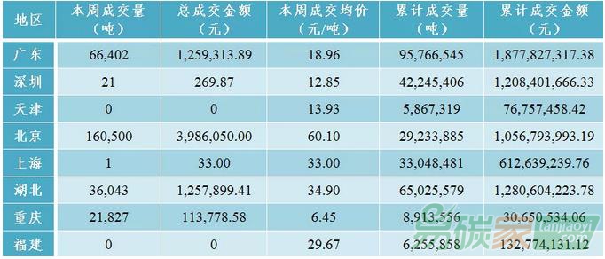 碳市場(chǎng)活躍度明顯下降,共成交配額28.48萬噸,較前一周下跌80.18%,總成交金額為661.73萬元,較前一周下跌22.15%。廣東碳市場(chǎng)上周成交配額6.64萬噸,成交均價(jià)為18.96元/噸,較前一周上漲23.76%。