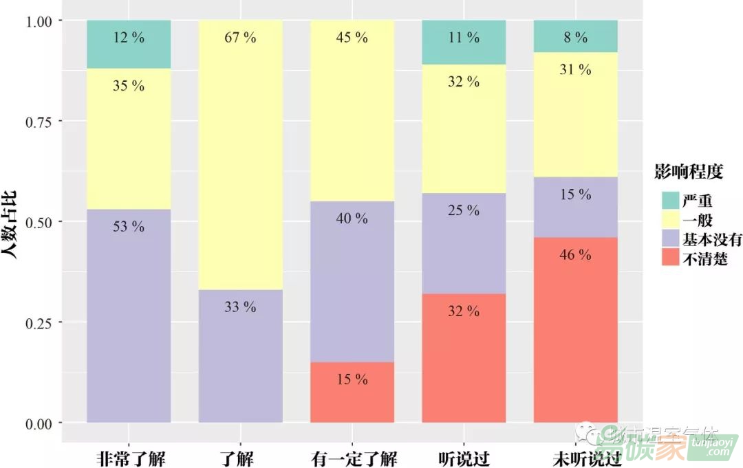 認為影響嚴重和影響一般的被訪談者比例有所增高。培訓前就非常了解CCUS技術的被訪談者對影響程度的判斷兩極分化比較嚴重,12%認為影響嚴重,53%認為基本沒有影響;培訓前對CCUS技術比較了解的被訪談者,多數(shù)認為影響程度一般(圖8),一定程度上說明,對于CCUS環(huán)境風險的研究方法和評估技術尚不完善,因而對于結(jié)果的預期產(chǎn)生較大差異。