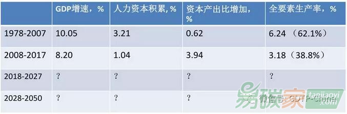表里列舉的是清華大學(xué)經(jīng)管學(xué)院白重恩老師的數(shù)據(jù),他把1978-2007年以及最近十年的GDP增速分解成人力資本積累,資本產(chǎn)出比增加和全要素生產(chǎn)率貢獻(xiàn),這是增長經(jīng)濟(jì)學(xué)的基本分析。