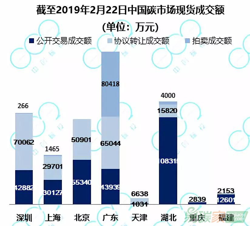 截至2019年2月22日,8個(gè)區(qū)域碳市場一、二級現(xiàn)貨市場累計(jì)成交2.86億噸,總成交額62.37億元。廣東、湖北成交量最高,位于第一梯隊(duì);深圳、上海、北京位于第二梯隊(duì);而天津、重慶、福建的成交量相對較低,位于第三梯隊(duì)。