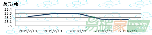 新西蘭碳市場2019年02月18日至2019年02月24日,新西蘭碳市場價(jià)格在25.05-25.30美元/噸之間波動(dòng)。