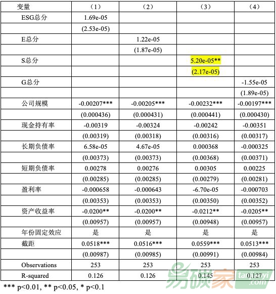 本文對(duì)服務(wù)業(yè)253個(gè)樣本展開實(shí)證研究(如下表3),結(jié)果顯示:在服務(wù)業(yè)中,社會(huì)表現(xiàn)總分與企業(yè)創(chuàng)新呈現(xiàn)正相關(guān),且顯著水平達(dá)到5%。因此,對(duì)于服務(wù)業(yè)企業(yè)而言,提升社會(huì)表現(xiàn)能顯著提升企業(yè)的創(chuàng)新。