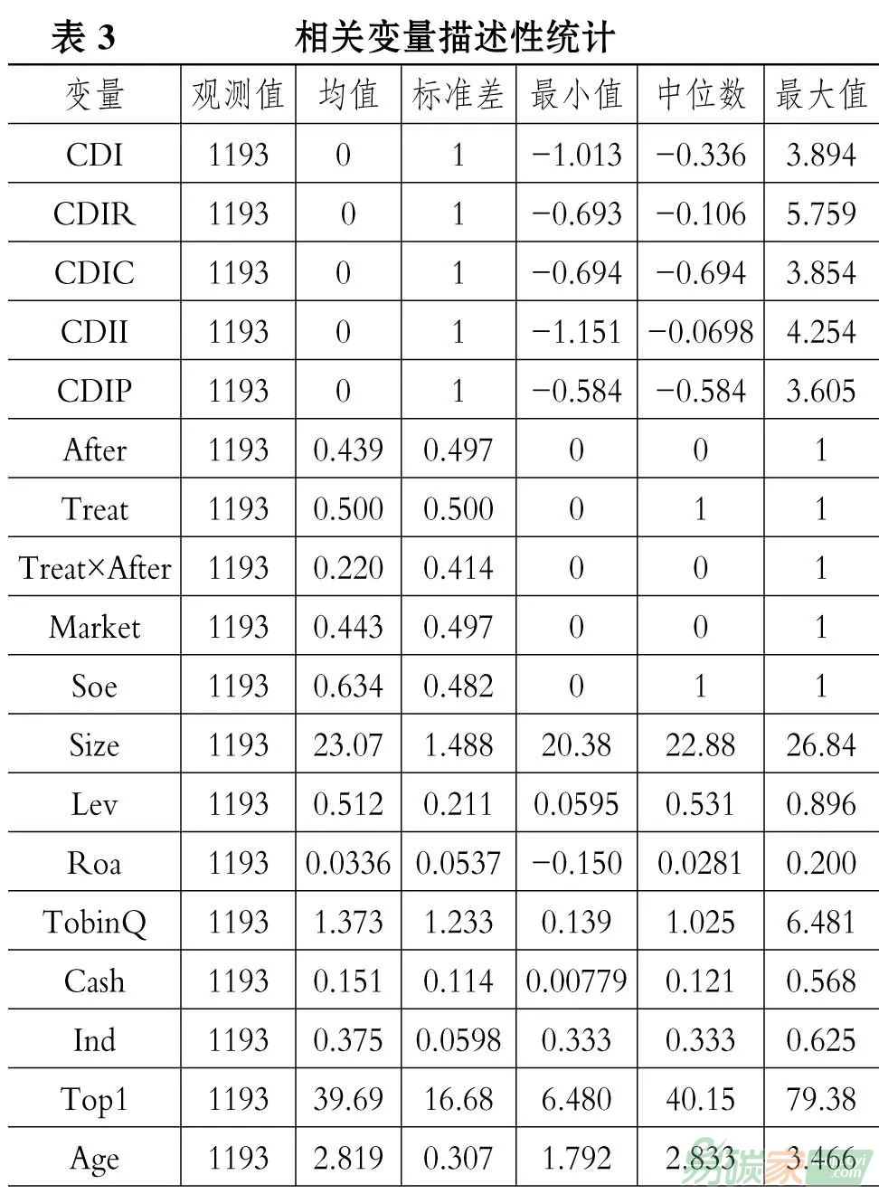 表3列示了本文相關(guān)變量的描述性統(tǒng)計結(jié)果。其中,對碳透明度變量進行Z-Score標準化后,CDI的最小值為-1.013,最大值為3.894,說明樣本企業(yè)之間存在明顯的差距,中位數(shù)為-0.336,均值為0,說明樣本中有超過半數(shù)的企業(yè)進行了較多碳透明度的披露。CDIR和CDIC的最小值分別為-0.693和-0.694,最大值分別為5.759和3.854,這說明樣本企業(yè)在年報碳透明度中的差距大于社會責(zé)任報告碳透明度。另外,我們發(fā)現(xiàn)CDII和CDIP的最小值分別為-1.151和-0.584,最大值分別為4.254和3.605,說明相對碳績效透明度而言,樣本企業(yè)在碳管理透明度中的差距較大。Treat和After的均值都接近0.5,這說明整個數(shù)據(jù)結(jié)構(gòu)相對均衡。