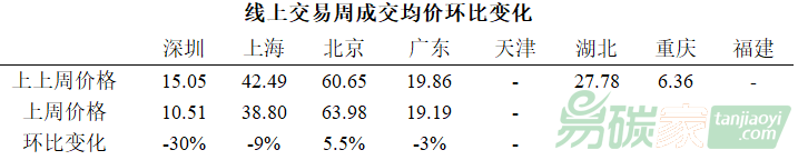 北京公開交易成交均價最高,為60.65元/噸,其次為上海,成交均價38.80元/噸。在連續(xù)兩周發(fā)生交易的區(qū)域市場中,北京、上海、湖北(29.41元/噸)和廣東(19.19元/噸)市場的價格表現(xiàn)穩(wěn)定,變動幅度均不超過10%。