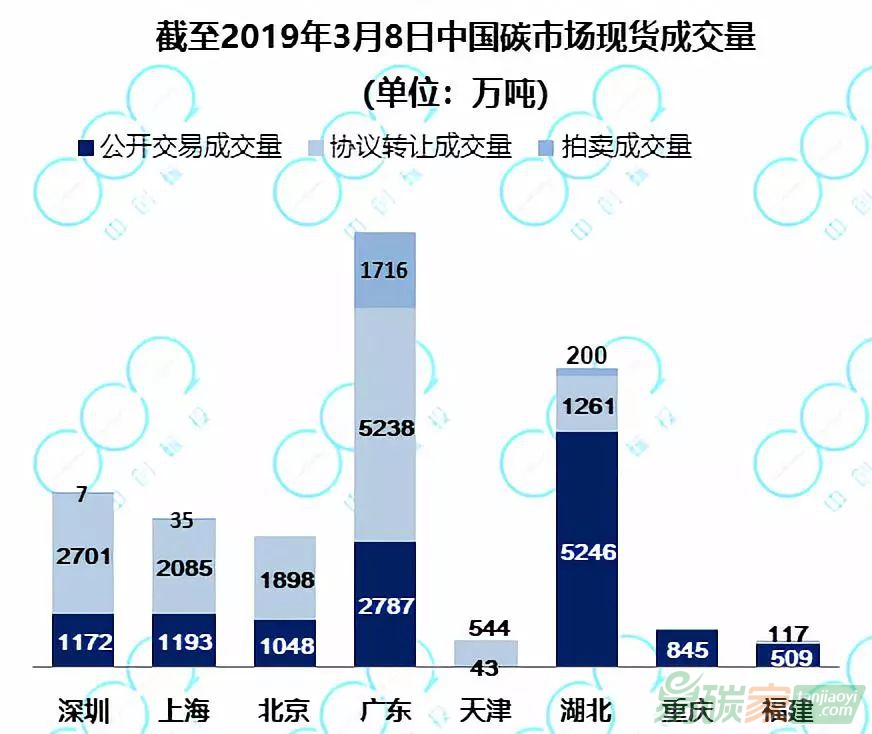 截至2019年3月8日,8個區(qū)域碳市場一、二級現(xiàn)貨市場累計成交2.87億噸,總成交額62.57億元。廣東、湖北成交量最高,位于第一梯隊;深圳、上海、北京位于第二梯隊;而天津、重慶、福建的成交量相對較低,位于第三梯隊。