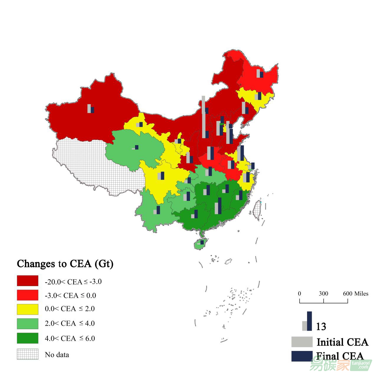 Fig. 5. Geographical distribution of provincial CEA through reallocation.