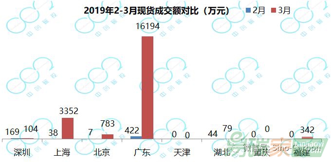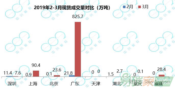 2019年3月,二級市場成交量和交易額較2019年2月有大幅上漲,共計成交978.6萬噸,實現(xiàn)交易額2.1億元,均較前一月擴(kuò)大了約30倍,其主要貢獻(xiàn)來自于廣東市場。